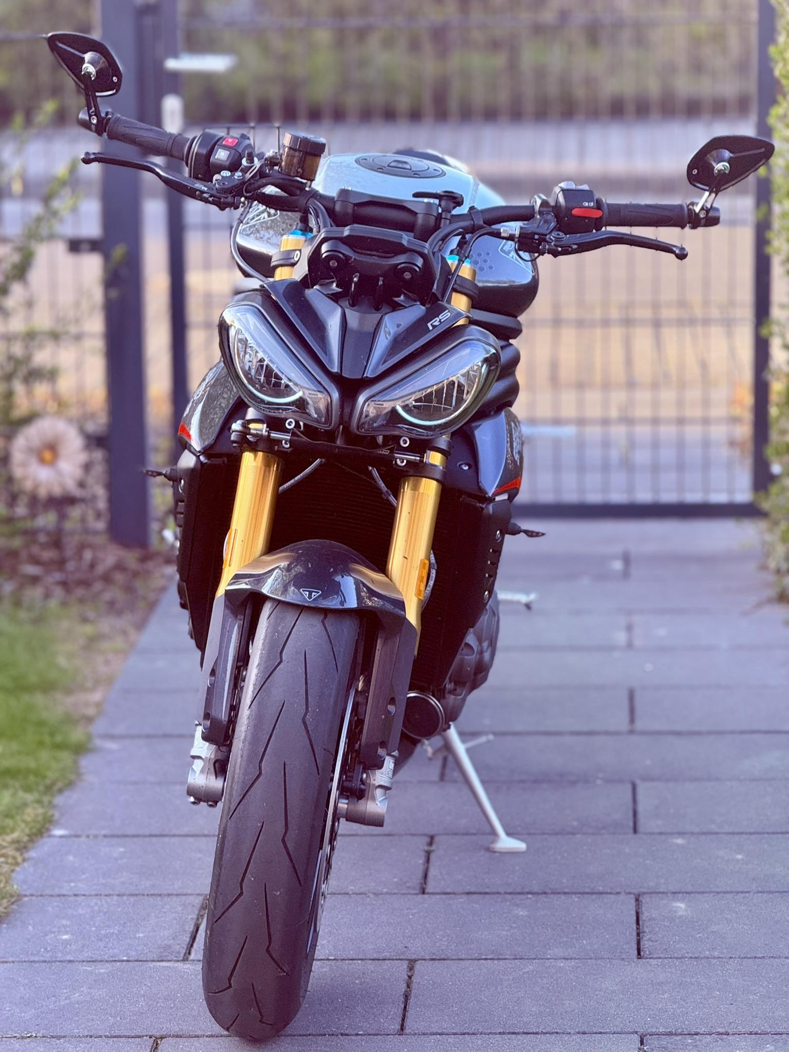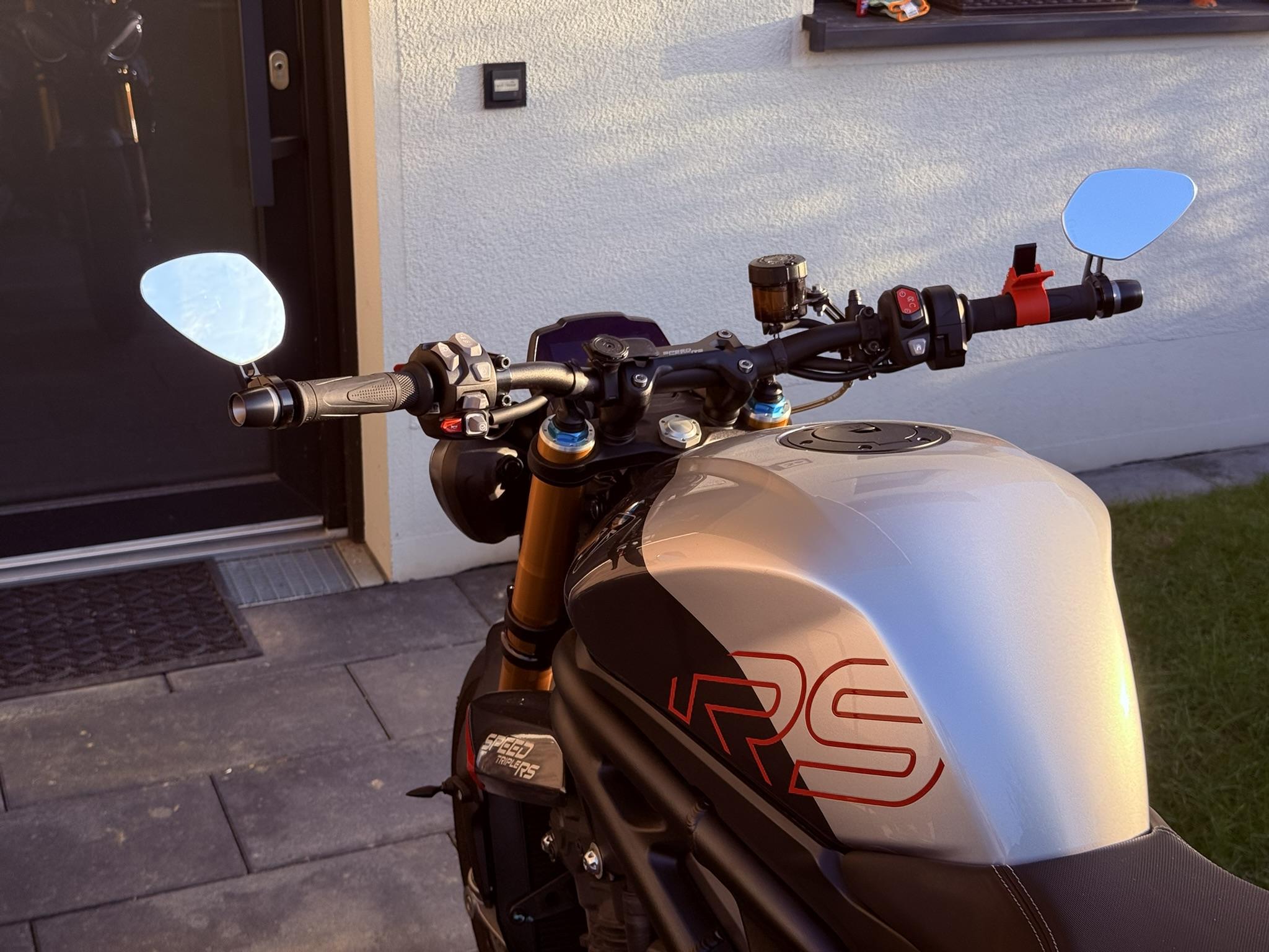 Hallo zusammen, ich war rein optisch gesehen nie ein großer Fan von Lenkerendspiegeln, aber seit dem Kauf der Speedy habe ich mich aber damit arrangiert, vor allem die bessere Sicht nach hinten im Vergleich zu den meisten Standardspiegeln haben mich überzeugt. Dennoch fand ich das Vibratiosniveau der Spiegel nicht optimal, ab 50 km/h sehe ich eigentlich nichts mehr wirklich klar (kommt sicher auch auf Gang und Drehzahl an) und wie gesagt optisch war es noch nie meins. Jetzt habe ich mehr oder weniger sehr spontan im Affekt bei Louis die Motogadget mo.view sport 60 Spiegel mitgenommen und montiert. Durch Zufall hatte ich auch noch Lenkerenden von Rizoma von meiner alten MT09, die erstaunlich gut dazu passen. In Summe bin ich mit der Lösung jetzt deutlich zufriedener und auch die Vibrationen sind deutlich geringer, sodass ich bis ca. 100-120 km/h noch alles hinter mir erkennen kann. Negativ ist die anscheinend starke Kratzempfindlichkeit der Spiegelflächen, da es sich um poliertes Alu handelt. Wie sind eure Erfahrungen mit den Originalspiegeln? Hat auch jemand andere montiert? Wie sind da die Erfahrungen? Beste Grüße Raphael
