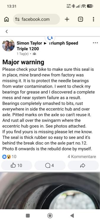 Hallo zusammen, ich habe in einer Facebook Gruppe gelesen, dass es bei ersten Modell einen vergessenen Dichtring an der Hinterachse gibt, sodass Wasser mit Leichtigkeit eindringen kann. Im schlimmsten Fall gab es wohl auch Schäden durch blockierte Hinterräder. Im Anhang die Bilder von dem Post. Ich habe bei mir geschaut und an meiner 2023 1200RR ist an dieser Stelle tatsächlich kein Dichtring. -