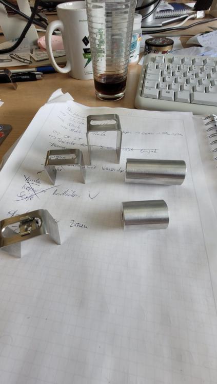 Ich hab mit Rohrbögen gearbeitet...48mm durchmesser, dann reduzierstücke das ich auf den kleineren Durchmesser für den Endtopf komme. Dann mir mittels CAD 2 Halter konstruieren, laserprogramm geschrieben, gelasert, gekantet, dann am Rohr auf Position gehalten, markiert und angeschweist. Für das hitzeblech habe ich die Aussparung so gewählt, dass ich ne Käfigmutter einsetzen konnte, der andere wird ( Rahmenseite) mit Schraube und Mutter fixiert, hab da den Halter so gemacht dass ich ne Flanschmutter mit Verzahnung anfädeln konnte