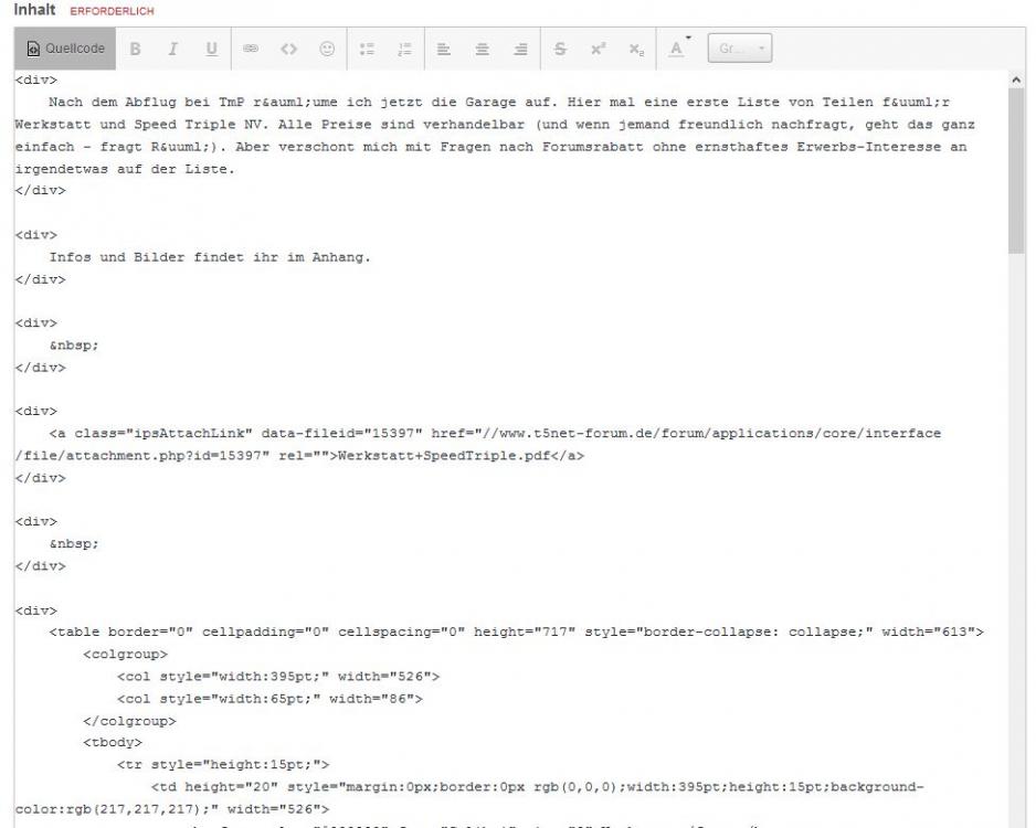 yab Geschrieben 21. Oktober 2016 report Geschrieben 21. Oktober 2016 Bis vor einiger Zeit konnte man sich den Sourcecode von Beiträgen anzeigen lassen und in dem Modus auch editieren. Nachdem ich die Tabelle unter dem Link auf das PDF (oder was das ist) in meinem Beitrag nicht ergänzen kann (bestehenden Inhalt ändern geht, Zeile einbauen irgendwie nicht, das ganze löschen und wieder per copy&paste reinwerfen auch nicht - oder ich bin zu blöd), hätte ich das ggf. gerne im Source versucht. Scheint aber wegkonfiguriert, das Feature. Oder? Wo muss ich hin klicken? :) Falls relevant: Browser IE11, Edge und Chrome. Wenn es keinen Weg zum Source mehr gibt und ihr die Möglichkeit habt: werft die Tabelle bitte aus dem Beitrag raus. Ich baue die dann in plain text wieder ein. Danke!