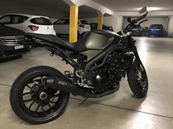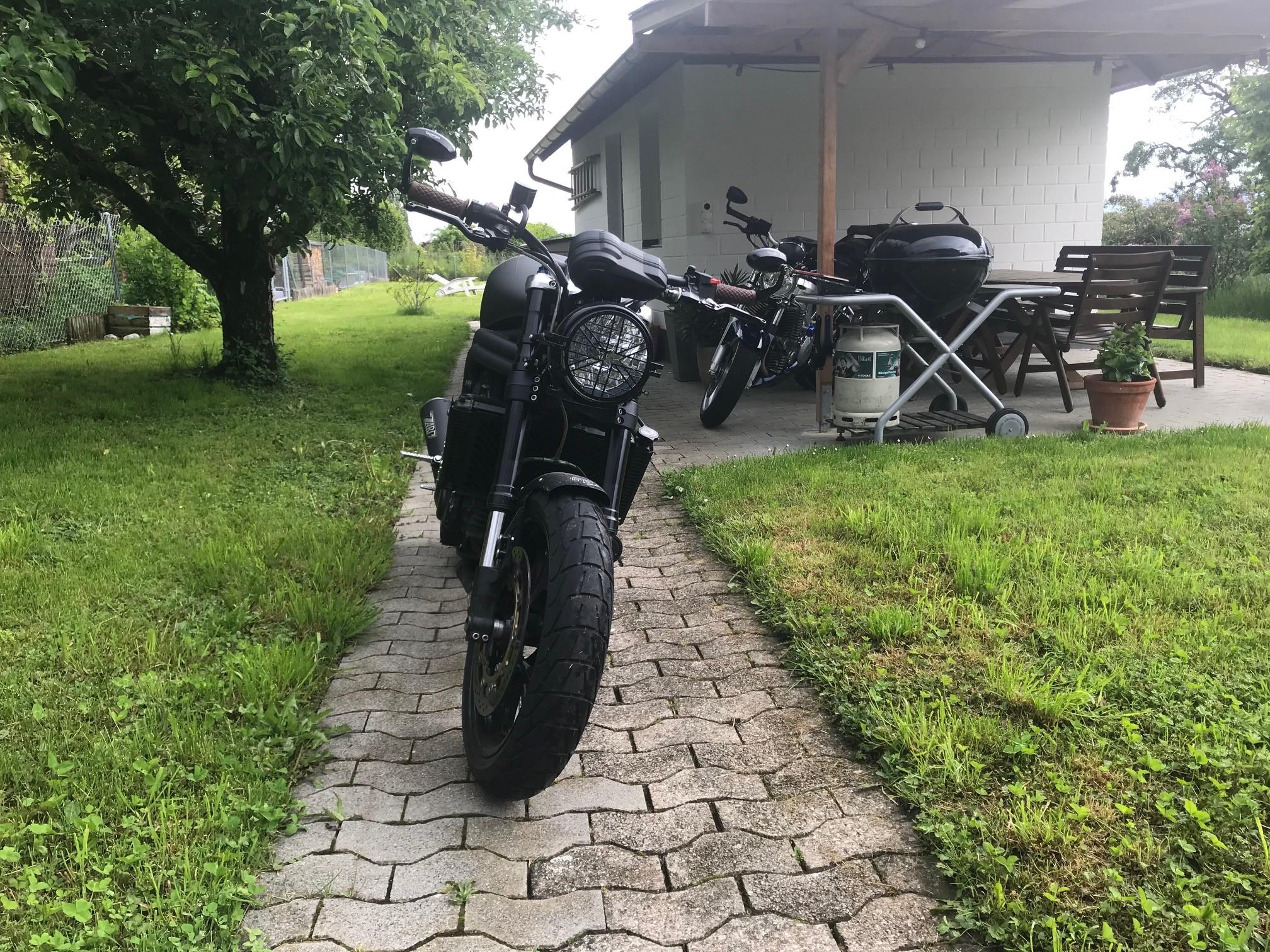 Schattinho Geschrieben 12. Juli 2017 report Geschrieben 12. Juli 2017 Hallo zusammen! Seit Kurzem darf ich eine Triumph mein Eigen nennen, weshalb ich nun in diesem Forum stöbere und mich entsprechend auch vorstellen möchte: Mein Name ist Roli (Roland), ich bin Baujahr 1981 und komme aus der schönen Schweiz (Grossraum Zürich). Ich bin gelernter Kfz-Mechaniker, arbeite jedoch seit 2004 in einem anderen Dienstleistungssektor. Seit dem Jahr 2006 fahre ich Motorrad und dies bis dato immer auf der gleichen Maschine, einer 2004er Suzuki SV1000, in Dark Space Blue metallic. Ich bin (noch) kein grosser Tourenfahrer, weshalb sich meine jährliche Kilometerleistung zwischen 4000 und 5000 eingependelt hat. Die Suzuki habe ich 2006 neu (3km) gekauft und bin seitdem sehr glücklich mit ihr unterwegs. Trotzdem geisterte in meinem Kopf immer noch eine weitere Maschine herum, welche ich mir im Jahr 2011 beinahe neu gekauft habe. Die Vernunft hat damals allerdings gesiegt, weshalb ich sie mir nun 2017 als sehr gut erhaltene Gebrauchte geholt habe: Die Triumph Speed Triple 515NJ (2010) in Matt Khaki Green, mit 19000 km auf der Uhr. Noch steht die Schöne allerdings beim Freundlichen, wo vor der Auslieferung noch Pazzo Brems- und Kupplungshebel und ein Magura CPX-Lenker montiert werden. Ich bitte deshalb auch, die Fotoqualität zu entschuldigen, ich hatte noch nicht die Möglichkeit, bessere Aufnahmen zu schiessen. Meine Pläne mit der Speed Triple sind nun, sie bis Ende Jahr so oft wie möglich zu bewegen, ohne gleichzeitig die SV zu vernachlässigen (V2 macht halt schon sehr viel Spass )... Im Winter werde ich sie dann in die Werkstatt stellen und der Umbau, welcher mir vorschwebt, nimmt hoffentlich bald konkrete Formen an. Der Umbau wird dann vielleicht nicht jedem gefallen (kein Streetfighter!) und ich bin auch noch nicht sicher, ob es so wird, wie in meinen Vorstellungen. Schlussendlich habe ich aber alles so geplant, dass die Speedy 1:1 wieder in den Originalzustand zurückversetzt werden könnte. Bis dahin lasse ich mich hier weiter inspirieren und vielleicht bin ich dann und wann auch mal froh um einen Tipp der Spezialisten hier... Vielen Dank fürs Durchlesen! Gruss Roli Zitieren