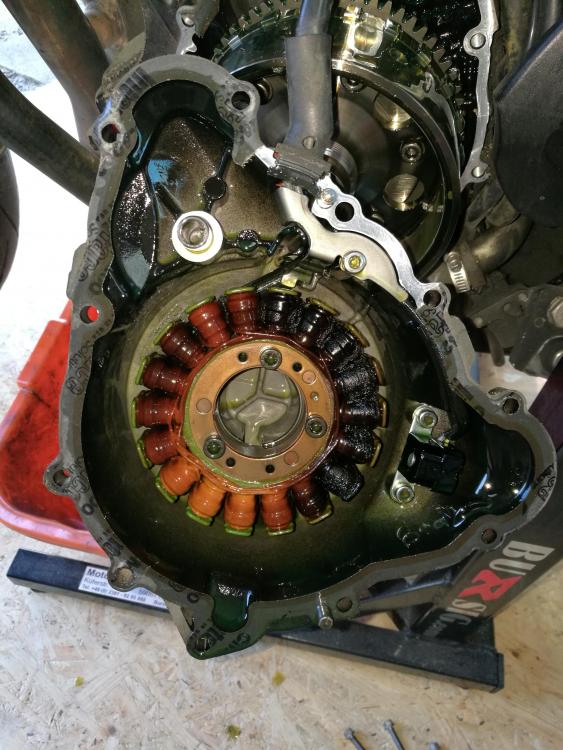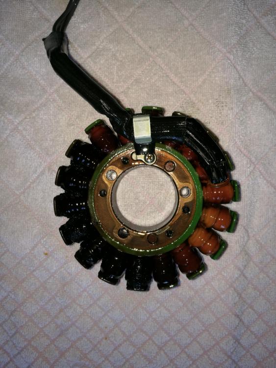 darklife Geschrieben 19. Mai 2018 Autor report Geschrieben 19. Mai 2018 Ein Stück bin ich weiter. Heute mal angefangen alles durchzumessen, nach diversen Anleitungen und Ratschlägen hier im Forum. Batterie ausgebaut, frisch geladen -> 13,0V eingebaut (Zündung aus) keine Änderung Zündung an -> 12,15V Motor läuft -> 12,35V steigt auch bei Drehzal um 4000-5000 nicht höher als 12,45V Batterie wieder abklemmen. Laderegler isolieren, alle Kabel-Steckverbindungen gelöst. Messgerät auf "Diodenfunktion" Messgerät "Plus" an Laderegler "Minus" - Messgerät "Minus" an die drei Phaseneingänge des Reglers. Anzeige 460/476/466, also nahezu gleich Messgerät "Plus" an Laderegler "Plus" - Messgerät "Minus" an die drei Phaseneingänge des Reglers. Überall kein Durchgang. Auf der Seite des Stators hatte ich zwischen allen drei Anschlüssen jeweils nahezu Durchgang. Allerdings hat mein Messgerät auch an allen drei Anschlüssen einen Schluss gegen Masse angezeigt. Das sollte nicht so sein, oder? Hier sollte es keine Verbindung geben, oder? Also dann Batterie wieder eingebaut, Regler nicht wieder verbunden. Motor gestartet. Zwischen den drei Phasen kommend vom Stator habe ich ca. 20V im Leerlauf und ca. bis 40V bei 4000-5000 gemessen. Sieht doch eigentlich gut aus? Jetzt wollte ich die Lichtmaschine auch sehen. Also alle Schrauben raus. Der Deckel war etwas eigenwillig fest. Lies sich auch durch Klopfen mit einem Kunststoffhammer nicht lösen. Erst etwas Hebelei mit einem Stück Holz zwischen einer der Nasen am Deckel und dem Block löste sich der Deckel. Ich hatte die obere Schraube noch losen eingeschraubt, damit mir der Deckel nicht gleich auf den Boden knallt. Als mir Flüssigkeit durch den ersten Spalt auf den Boden tropfte wurde ich unsicher und hab erst mal wieder den Deckel mit einigen Schrauben festgedreht, ohne ihn ganz zu lösen oder abzunehmen. Sieht aus wie Öl. Soll das so sein? und falls ja, wieviel kommt da raus? Ich hatte die Speedy auf einem Montageständer am Hinterrad stehen, also nicht Seitenständer. Wollte jetzt nicht auch gleich nen Ölwechsel machen. Wie beurteilt ihr so die ersten Messergebnisse? Zitieren
