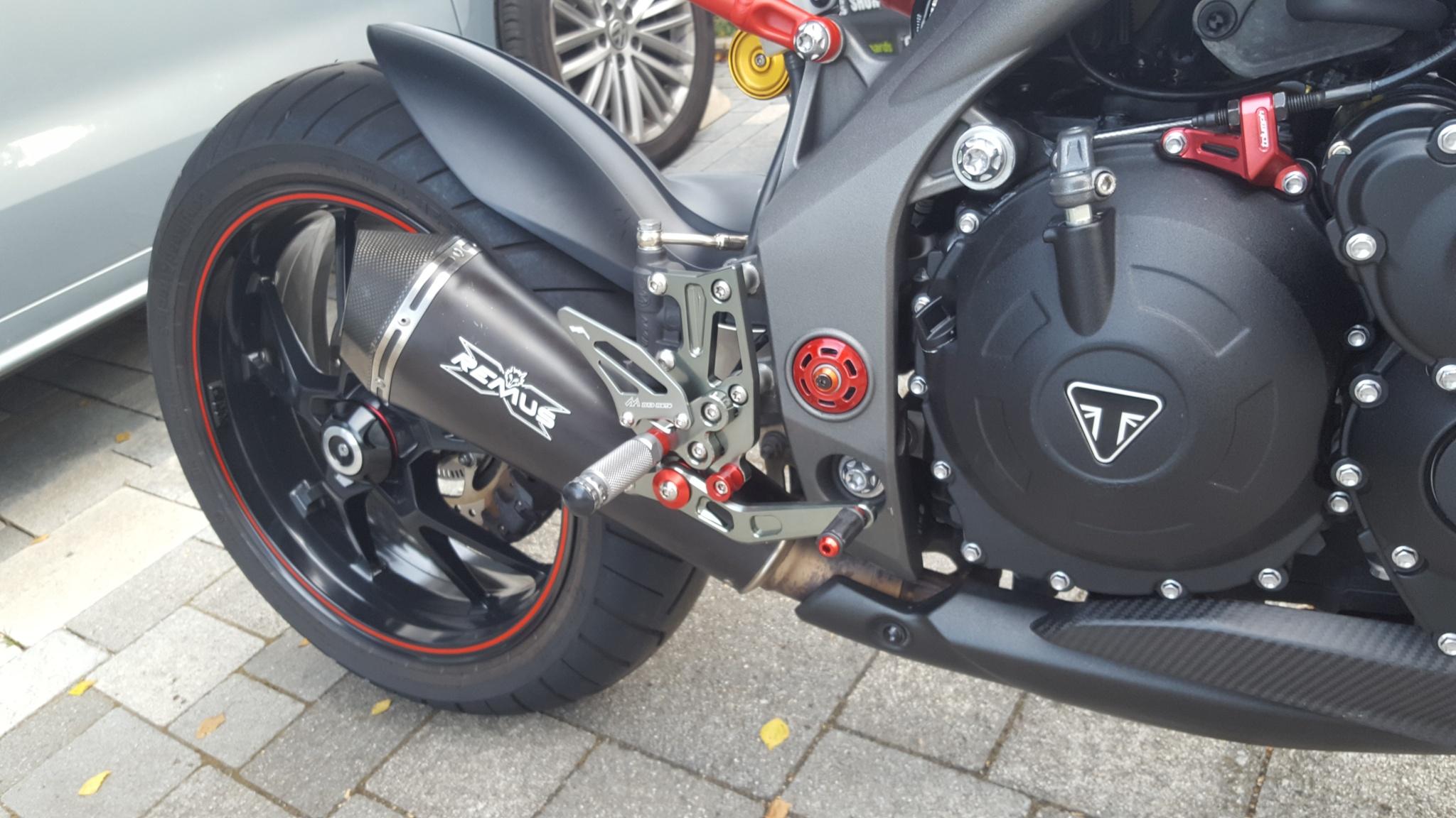 Die Montage auf der Bremsseite war frikelig, weil ich eine 3 in 1 Anlage habe. Die Rasten sitzen weiter hinten und kam an den Auspuff. Die Schraubpunkte für den Auspuffhalter waren an der Orginalanlage  und fielen somit weg.