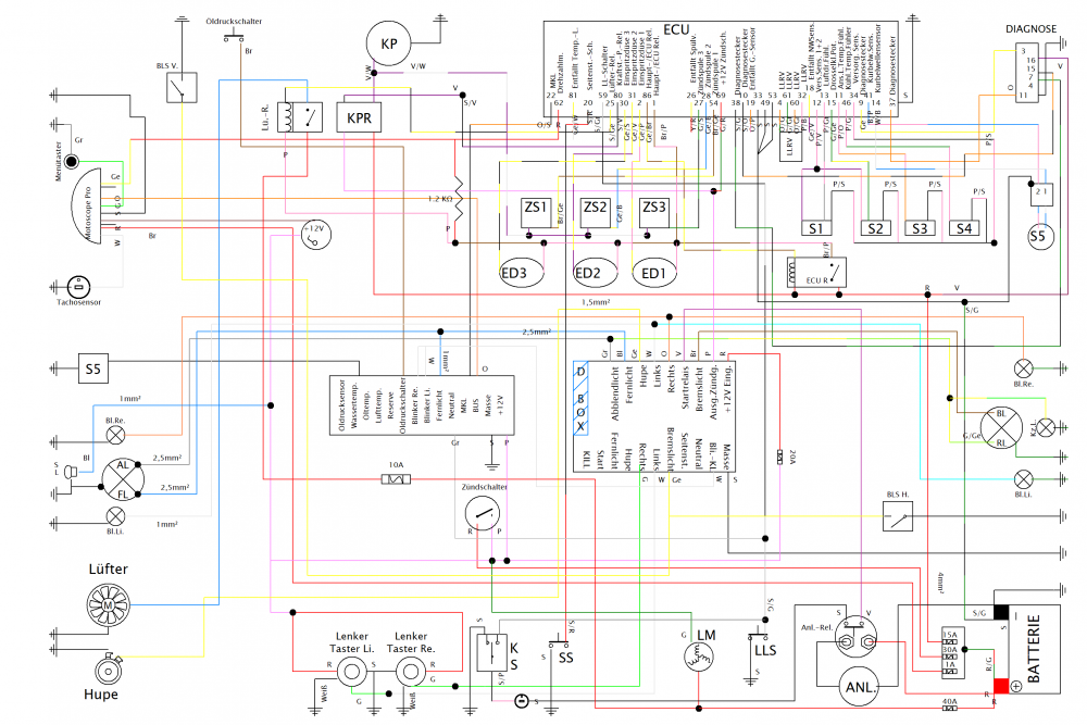 oldschoolbox29 Geschrieben 5. Dezember 2024 report Geschrieben 5. Dezember 2024 Ich werde mal versuchen, meinen Schaltplan hier reinzustellen. Ist zwar eine D-Box von joost in Verbindung mit einer Breakout Box von Motogadget, von der Funktionsweise aber genau dasselbe in Grün wie die M-Unit, bis auf Bluetooth und einige Zusatzfunktionen wie Alarmanlage. Schaltungsprinzip Box-Verbraucher-Masse ist das gleiche. An Relais sind geblieben: ECU Relais, Lüfterrelais und Kraftstoffpumpenrelais. Solltest du Mini Relais von Motogadget o.ä. verwenden, bitte daran denken, dass du die mit Sperrdioden versiehst, die haben die originalen Relais auch drin, schützen dein Steuergerät. Ich habe das Zündschloß wegrationalisiert und stattdessen einen einfachen Schalter eingebaut, d.h., hier müsstest du entsprechend des originalen Schaltplanes abändern, wenn du deines behalten willst. Der Schaltplan ist von mir selbst als Gedankenstütze und zur späteren Fehlersuche erstellt und entspricht nicht den gängigen Normen für Schaltpläne. Ich gebe ihn daher hier auch nur als Hilfestellung weiter und übernehme keine Haftung für weggebrutzelte Steuergeräte u.ä. Bei mir funktioniert das so einwandfrei Zitieren