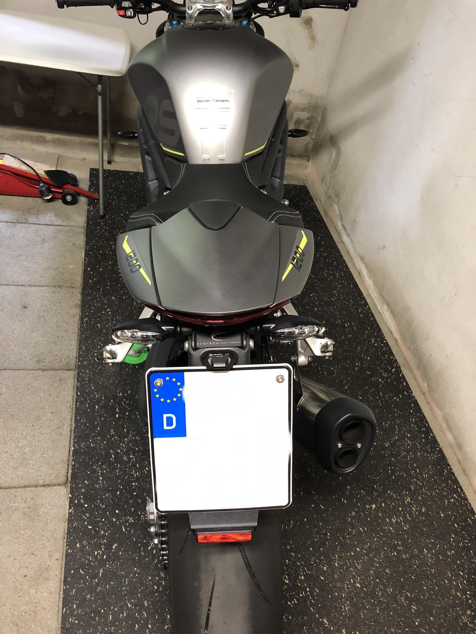 Nubbel Geschrieben 10. September 2021 report Geschrieben 10. September 2021 vor 10 Stunden schrieb Flipper: Ich habe mir die “Low Budget“ Variante von Evotech Italy geholt. Der Kennzeichenwinkel ist mit 30 Grad korrekt, Passform sehr gut. Vielleicht noch die Befestigung der Blinker etwas verlängern, damit es keine Diskussionen mit der Rennleitung gibt. Mindestabstand der leuchtenden Fläche ist 18 cm. Grüße Zitieren