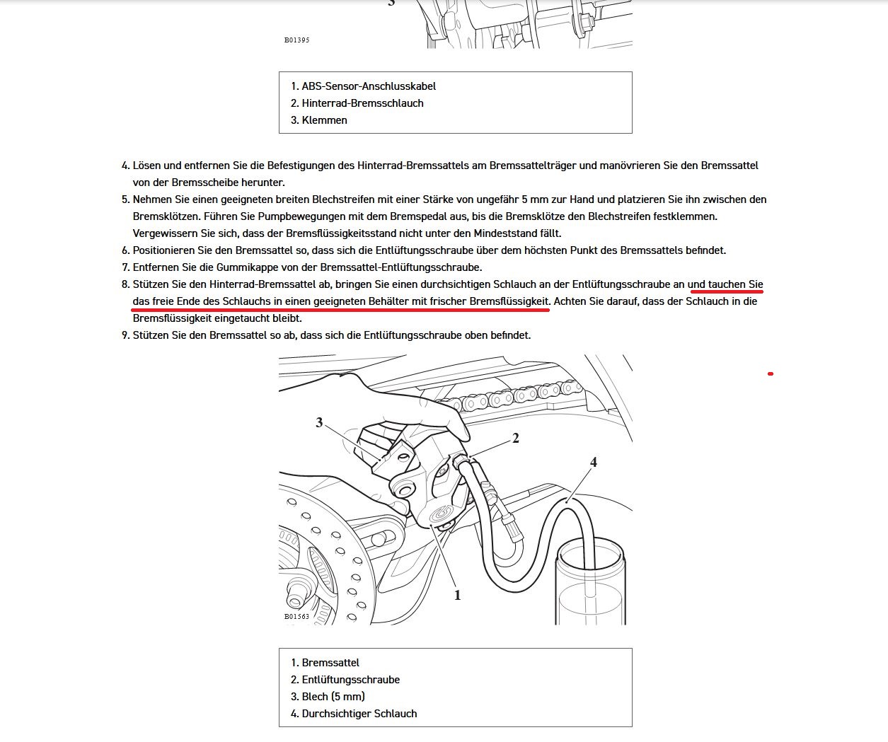 Roman87 Geschrieben 25. Juli 2022 report Geschrieben 25. Juli 2022 Hallo an alle, habe gestern meine Bremsen entlüftet. Vorne ging es auch ganz fix, nach 10 Minuten waren beide Seiten fertig. An der hinteren hing ich aber sage und schreibe 2 Stunden, ohne jeglichen Erfolg. Vorgegangen bin ich nach WHB, also 5x pumpen, beim letzten Pump das Pedal gedrückt halten, Ventil kurz etwas auf und zu, Pedal loslassen. Und das die ganze Zeit wiederholt. Oben zwischendurch neue Flüssigkeit nachgefüllt. Es baute sich ein wenig Druck auf, so nach 3-4 Pumpen, wenn ich jedoch wieder neu anfing, war da beim 1-2 Pump überhaupt kein Druck zu spüren. Habe gefühlt die halbe Flasche (250ml) Flüssigkeit durch die Leitung gejagt. Habe auch nach Anleitung den Sattel abmontiert und diesen so gedreht, dass das Ventil an der höchsten Stelle ist. Hat alles nichts gebracht, was kann ich noch tun? Was ich sehr merkwürdig finde ist, dass im WHB folgendes steht (Punkt 8): Seit wann wird es so gemacht? Warum das andere Ende in frische Flüssigkeit tauchen? Habe ich noch nie gehört, das muss doch ein Fehler sein. Macht für mich so keinen Sinn. In die Flasche kommt doch die alte Flüssigkeit rein und man schüttet oben in den Ausgleichsbehälter neue rein. Wie auch immer, ich habe das ABS Modul noch nicht entlüftet, könnte das Problem dadran liegen? Dankbare Grüße Roman Zitieren