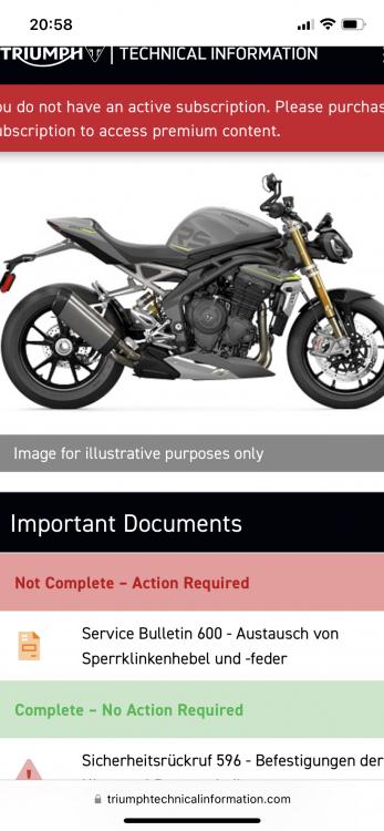 Michl 60 Geschrieben 2. Februar 2023 report Geschrieben 2. Februar 2023 vor 3 Stunden schrieb Kneesliding: wenn man hier schaut, Suchfunktion für Sicherheitsrückrufe | For the Ride (triumphmotorcycles.de) wird bei mir auch nichts angezeigt. nur unter: https://triumphtechnicalinformation.com/ sehe ich was. Ist bei mir auch so, beim oberen Link ist nichts hinterlegt. Beim unteren Link dagegen erscheint der Hitzeschutzschild. Ich hoffe nur, das bei der Reperatur der gebrochenen Schaltfeder bereits das verbesserte Material aus dem Rückruf verbaut wurde. Zitieren