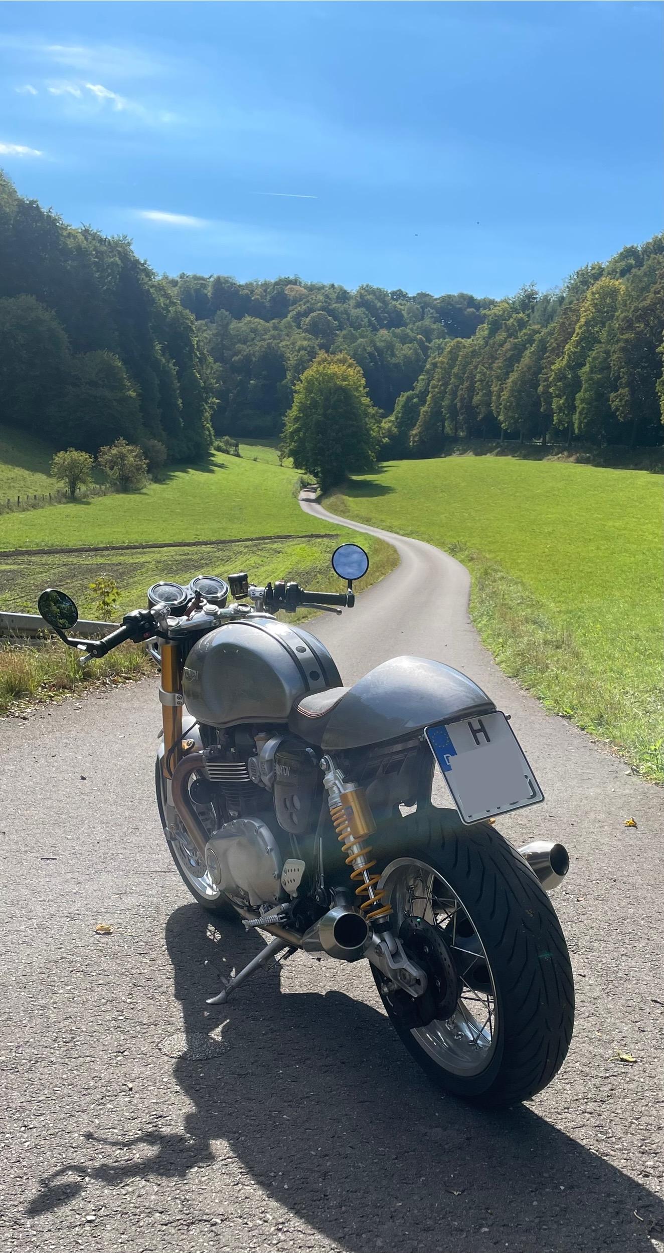F__rank Geschrieben Dienstag um 17:04 report Geschrieben Dienstag um 17:04 Hallo allerseits. Ich fahre jetzt seit etwa zwei Monaten meine erste Triumph. Anlass genug, mich einmal kurz vorzustellen. Ich komme aus Hannover, bin Mitte fünfzig und oft und gerne im Weserbergland unterwegs. Ich habe mir eine Thruxton 1200R gekauft. Ein tolles Motorrad, wie ich finde. Der klassische Look und das kräftige Drehmoment schon aus mittleren Drehzahlen haben es mir angetan. Vorgängerin der Thruxton war eine Guzzi V7 850. Auch ein tolles Motorrad mit viel Drehmoment von unten, aber eben auch mit 30 PS weniger. Das merkt man schon deutlich. Ich freue mich auf kurzweiligen Austausch und wünsche uns allen noch ein paar sonnige Tage. Heute war es ja schon mal nicht schlecht. Gleich mal das Wetter für ein Foto genutzt. Schönen Abend, Frank Rowdy reagierte darauf 1 Zitieren