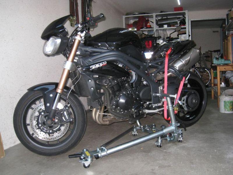 yab Geschrieben 18. August 2011 report Geschrieben 18. August 2011 So, jetzt ist er da und ausprobiert, der Becker-Technik Motolifter (mit Höhenverstellung und Rangier-Set). Funktioniert gut und die Handhabung ist ok. 5mal üben und man bringt das Mopped allein auf den Ständer. Das Video auf der Becker-Technik Seite stellt es wirklich realitätsnah dar. Bis jetzt standen ein 800er Tiger und die eine 2011er Speed Triple drauf. Entgegen anders lautender Meldungen kann ich die Speed Triple auch hinten runterziehen. Ggf. mit einer hand runterdrücken und mit der anderen die Ratsche bedienen - die Ratsche selbst ist etwas unterdimensioniert zum Heben der hohen Last vor der Schwingenachse. Zitieren